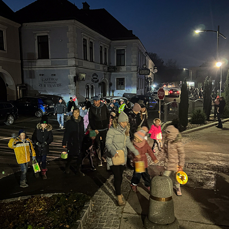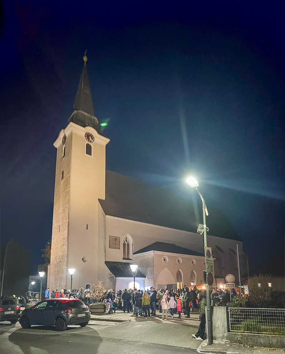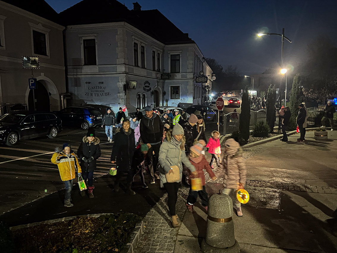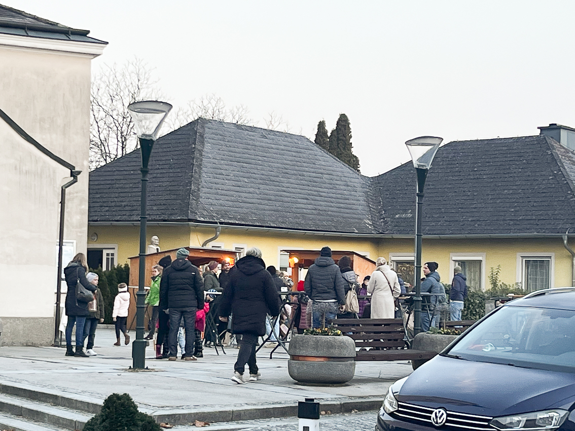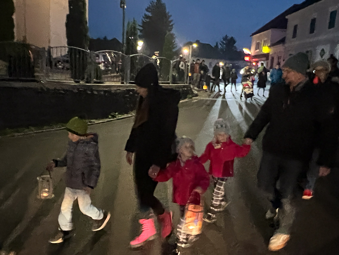 Der gemeinsame Laternenumzug durch Petzenkirchen fand am Kirchenplatz seinen Abschluss, wo die Kinder noch frische Haubis Briochekipferl zum Teilen bekommen haben.