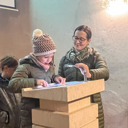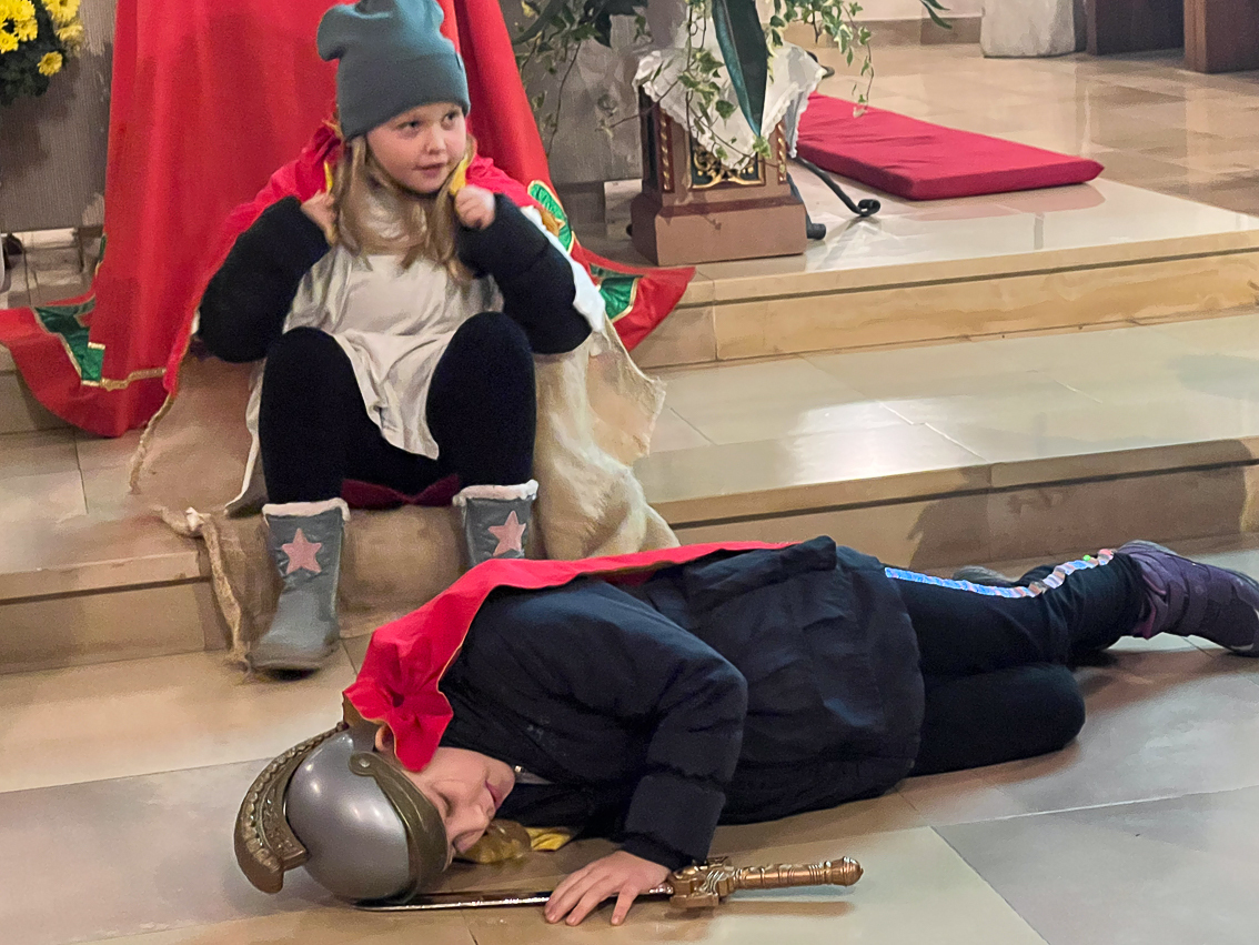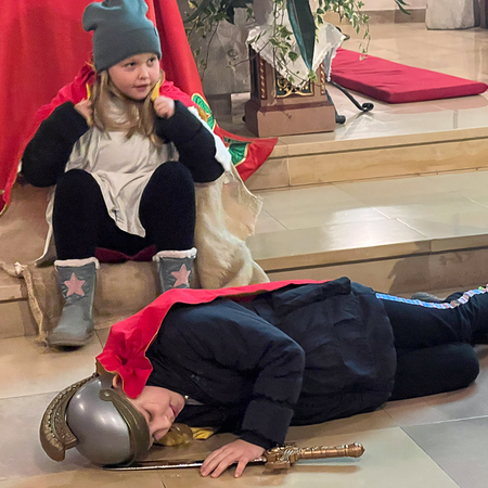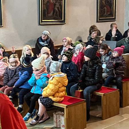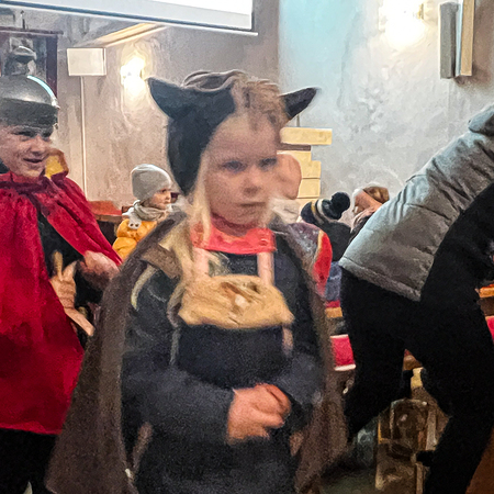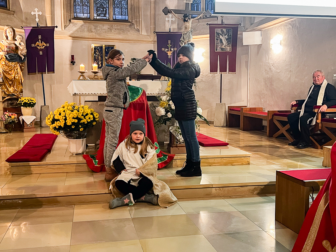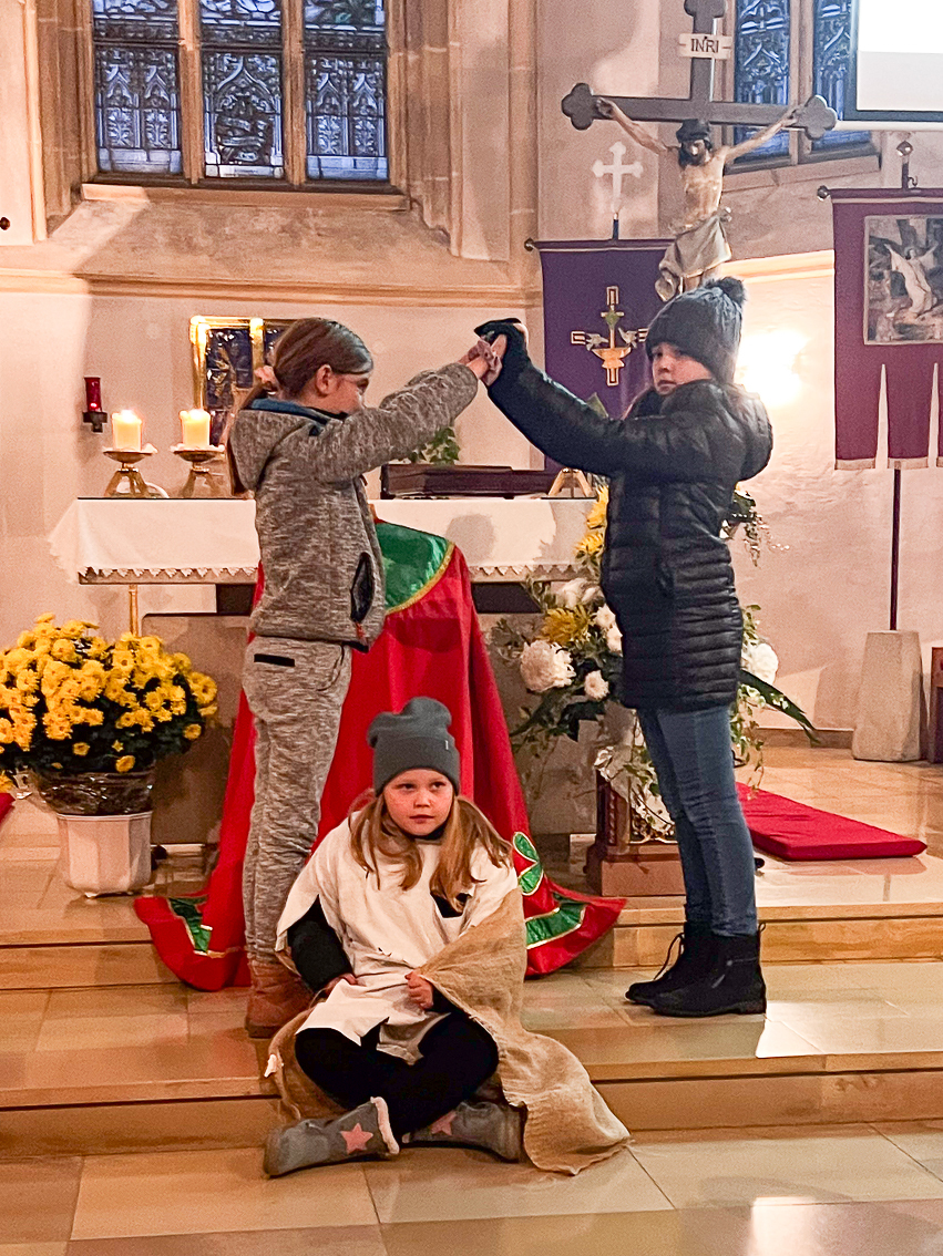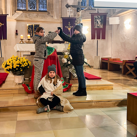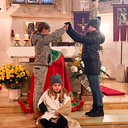 In einem Rollenspiel wurde die Martinsgeschichte von den Kindern dargestellt und musikalisch umrahmt. Nach den Fürbitten wurden Wollfäden an die Besucher/innen verteilt und um das Handgelenk gebunden - symbolisch für einen gemeinsamen Mantel.