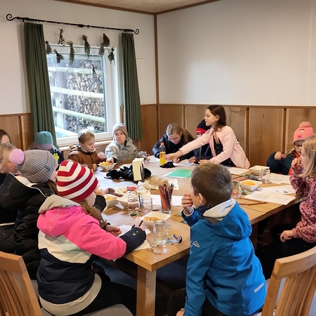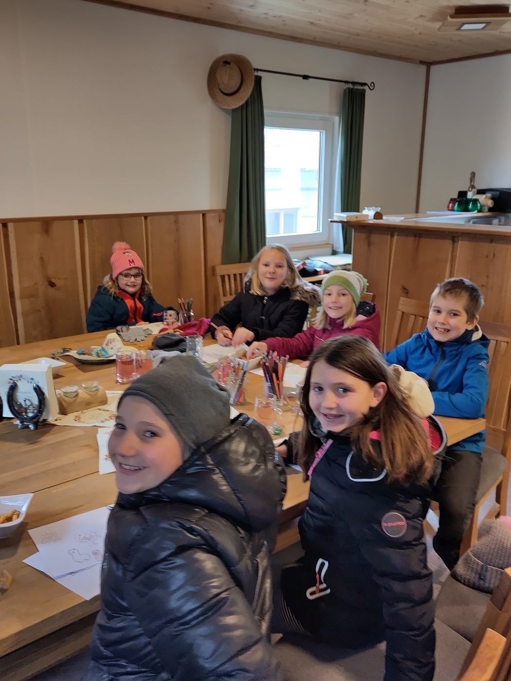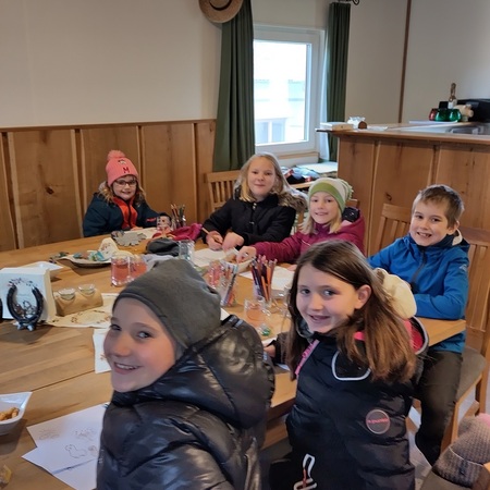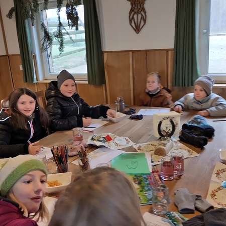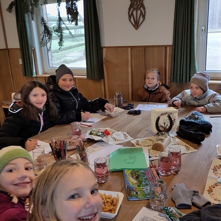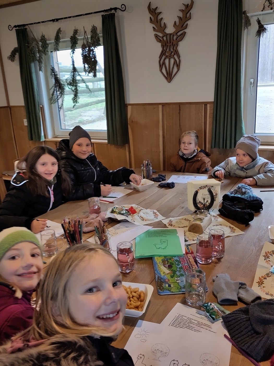 In einer gut beheizten Hütte neben der Alpakaweide konnten sich die Minis bei Getränken und Knabbereien aufwärmen, Alpakabilder anmalen und ein Alpakaquiz beantworten. Die Minis hatten gut aufgepasst und wussten viel.