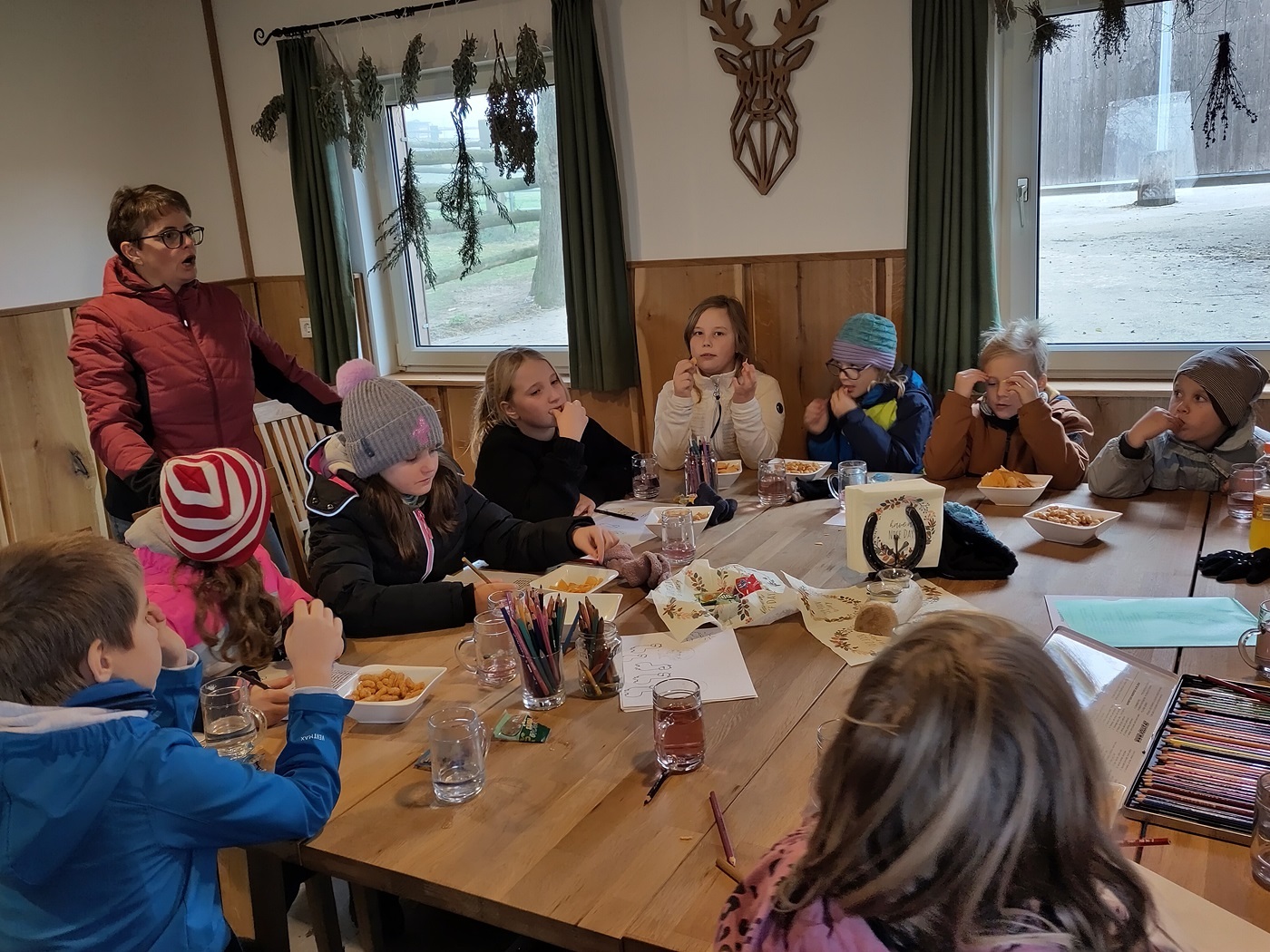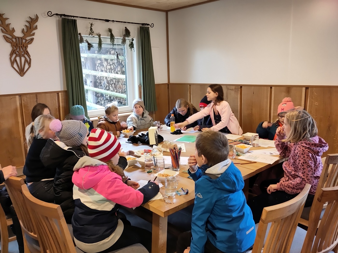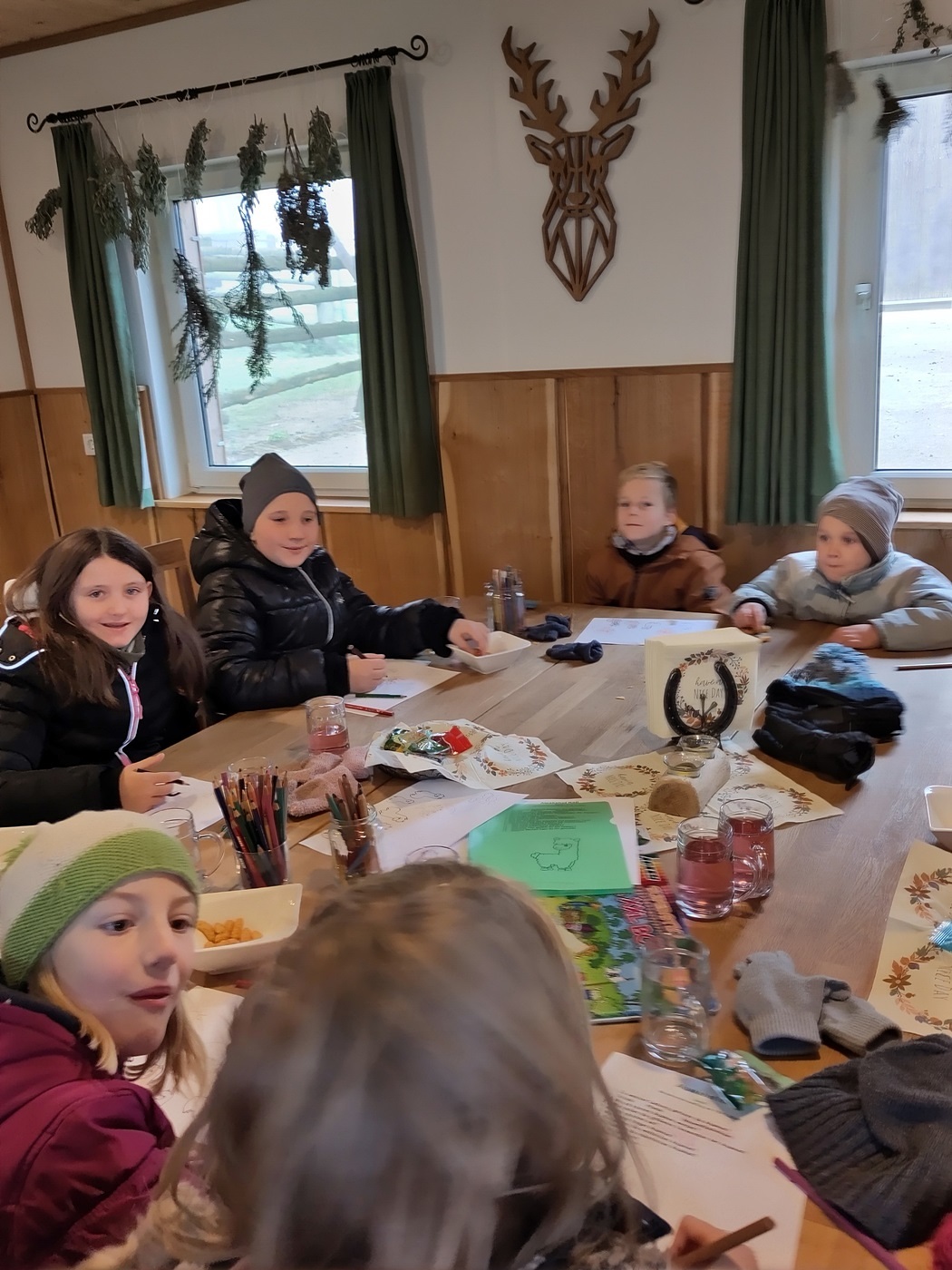 In einer gut beheizten Hütte neben der Alpakaweide konnten sich die Minis bei Getränken und Knabbereien aufwärmen, Alpakabilder anmalen und ein Alpakaquiz beantworten. Die Minis hatten gut aufgepasst und wussten viel.