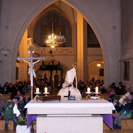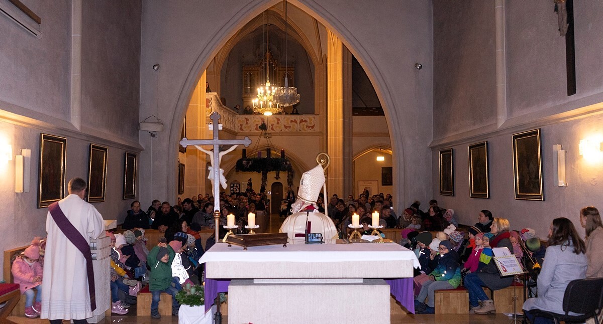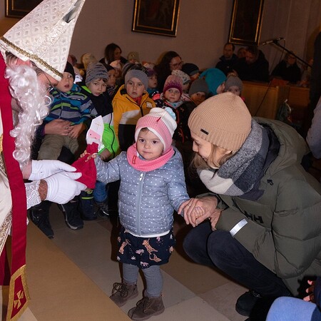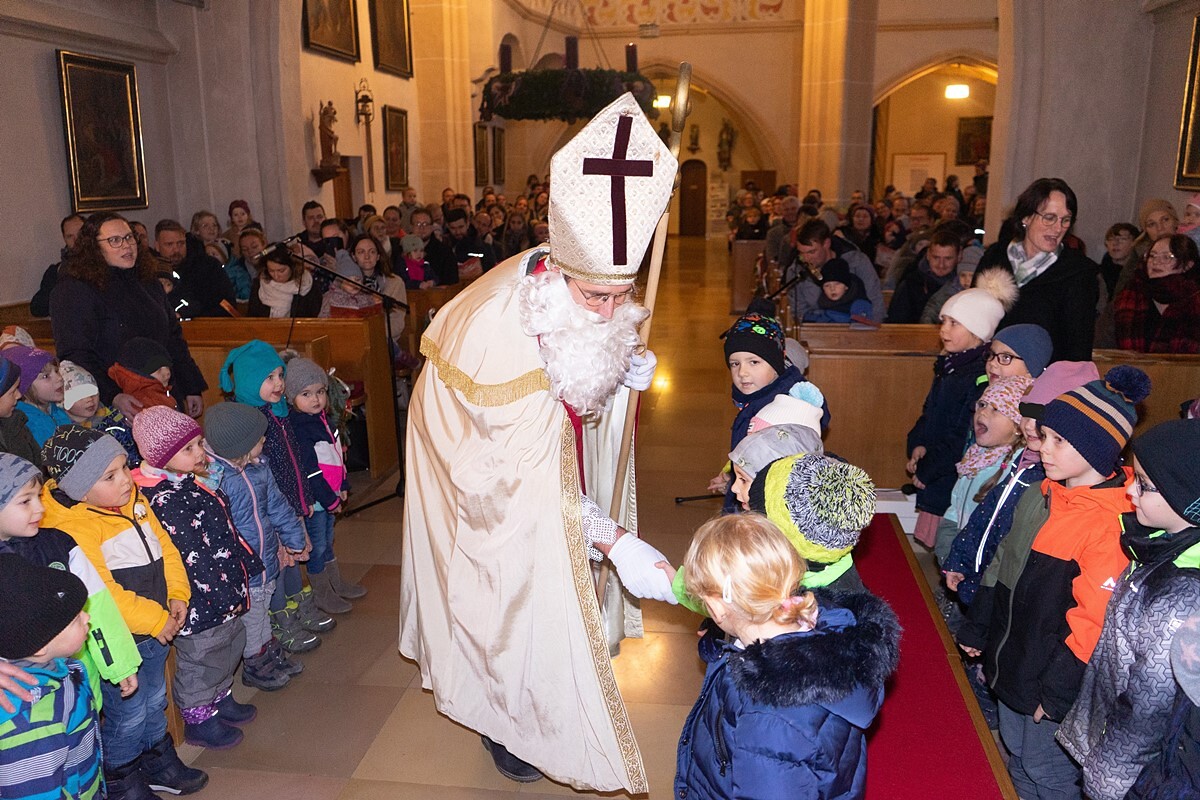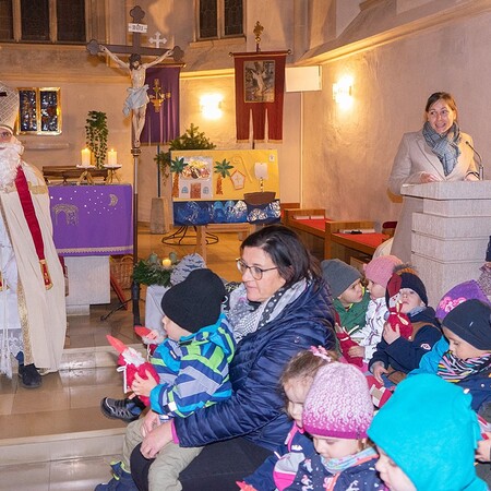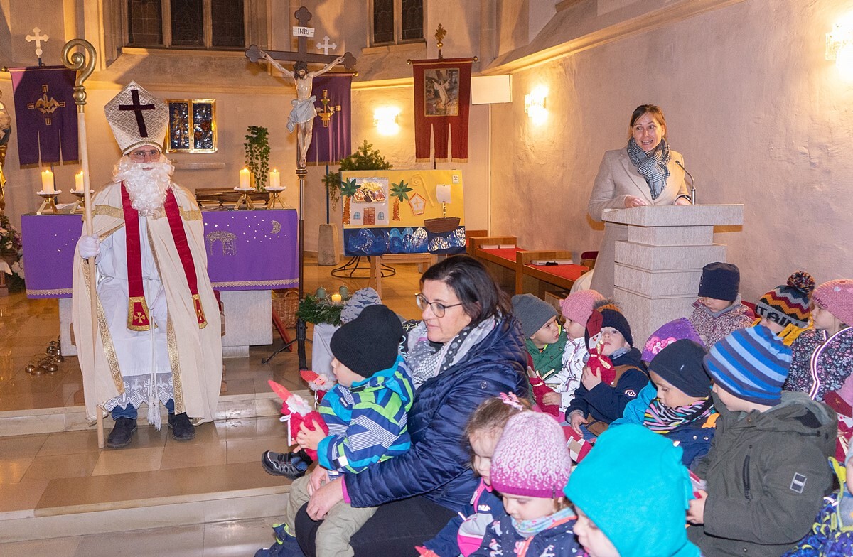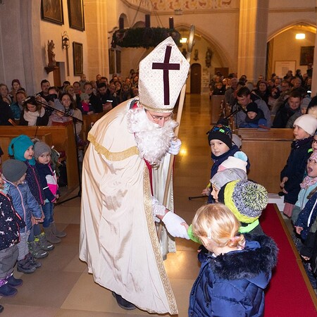 Die Kinder der Gemeinde Bergland freuten sich sehr auf die Nikolofeier in der Pfarrkirche Petzenkirchen. Unter der Leitung der Elementarpädagogin und Kindergartenleiterin Manuela Harrauer zogen die Kinder mit ihrem Team in die Kirche ein. Nach der Begrüßung wurde die Geschichte des heiligen Nikolaus in Text und Bildern vorgetragen. Zwischendurch sangen die Kinder mit Begeisterung Lieder. Schließlich war es soweit: Der heilige Nikolaus kam rückwärts durch den Mittelgang der Kirche, vorbei an strahlenden Kinderaugen. Er richtete einige Worte an die Kinder und verteilte anschließend kleine Nikolaussäckchen an jedes Kind.
