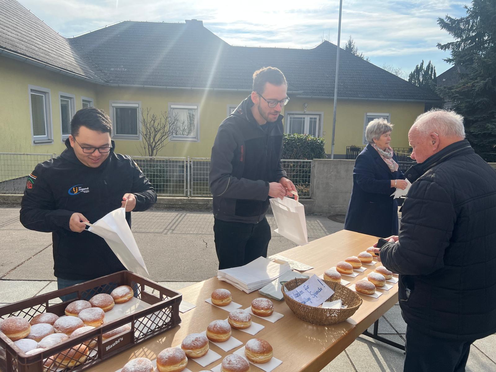 „Pfarrer i.R. Msgr. KR Mag. Franz Dammerer zelebrierte die Hl. Messe und zauberte am Ende der Messe mit einem Witz ein Lächeln auf die Gesichter der Kirchenbesucher. Anschließend gab es am Kirchenplatz Faschingskrapfen für freiwillige Spenden, und im Pfarrsaal war für einen Umtrunk gesorgt.“