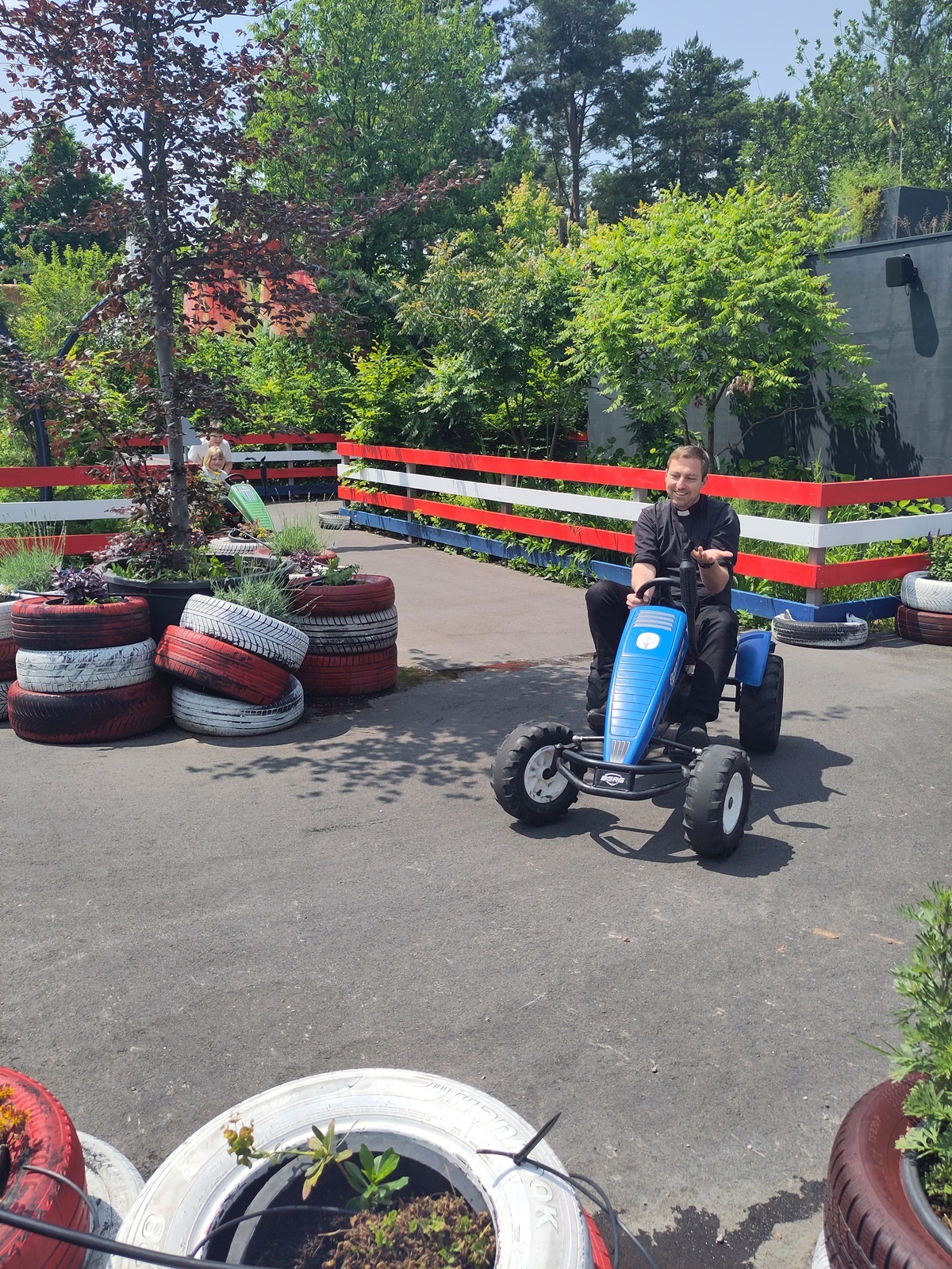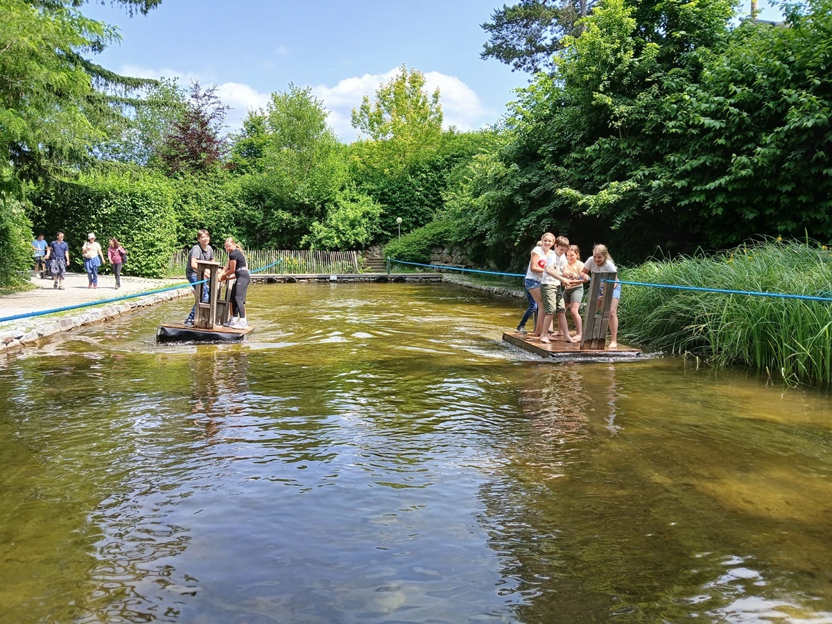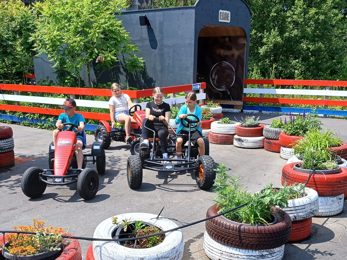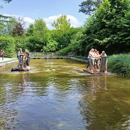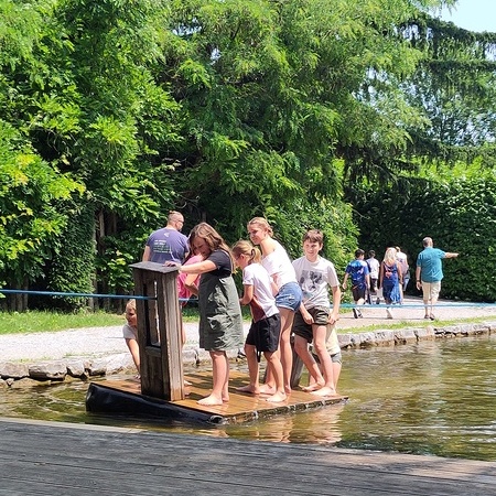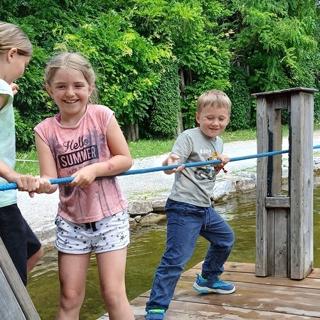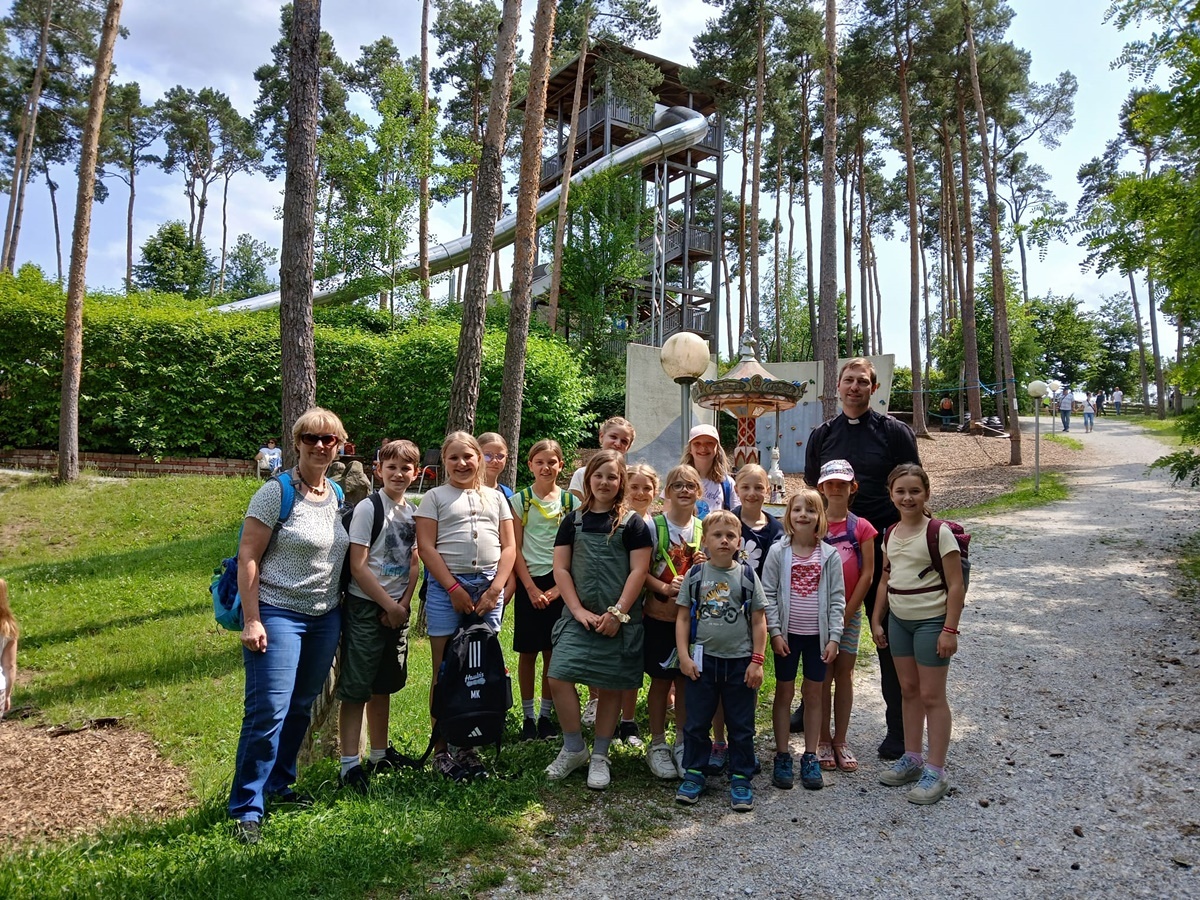 In der fantasievollen Gartenwelt jagte ein Highlight das nächste: Besonders beliebt war das Kartfahren auf der kleinen Rennstrecke des Parks bei dem kräftiges Treten und Lenktalent gefragt war. Auch Pater Stephan ließ es sich nicht nehmen, Runden zu drehen – sehr zur Freude der Kinder. Ein weiteres Highlight war die lange Rutsche, auf der die Kinder viel Freude hatten. Auch das Floßfahren sorgte für viel Lachen – vor allem, wenn es galt, das Gleichgewicht zu halten oder schneller als die anderen zu sein. Nach dem gemeinsamen Mittagessen sorgte der Quatschgärtner mit seinen lustigen Einlagen und verrückten Ideen für viel Spaß und beeindruckte die Gruppe mit tollen akrobatischen Einlagen. Im Labyrinth wurde der richtige Weg gesucht und auch Fangen und Verstecken gespielt. Beim Fischteich gelang es einigen, Fische zu „streicheln“.