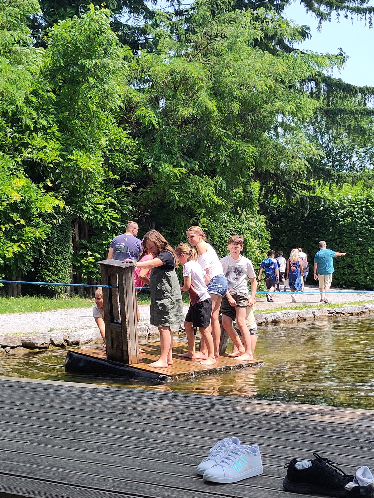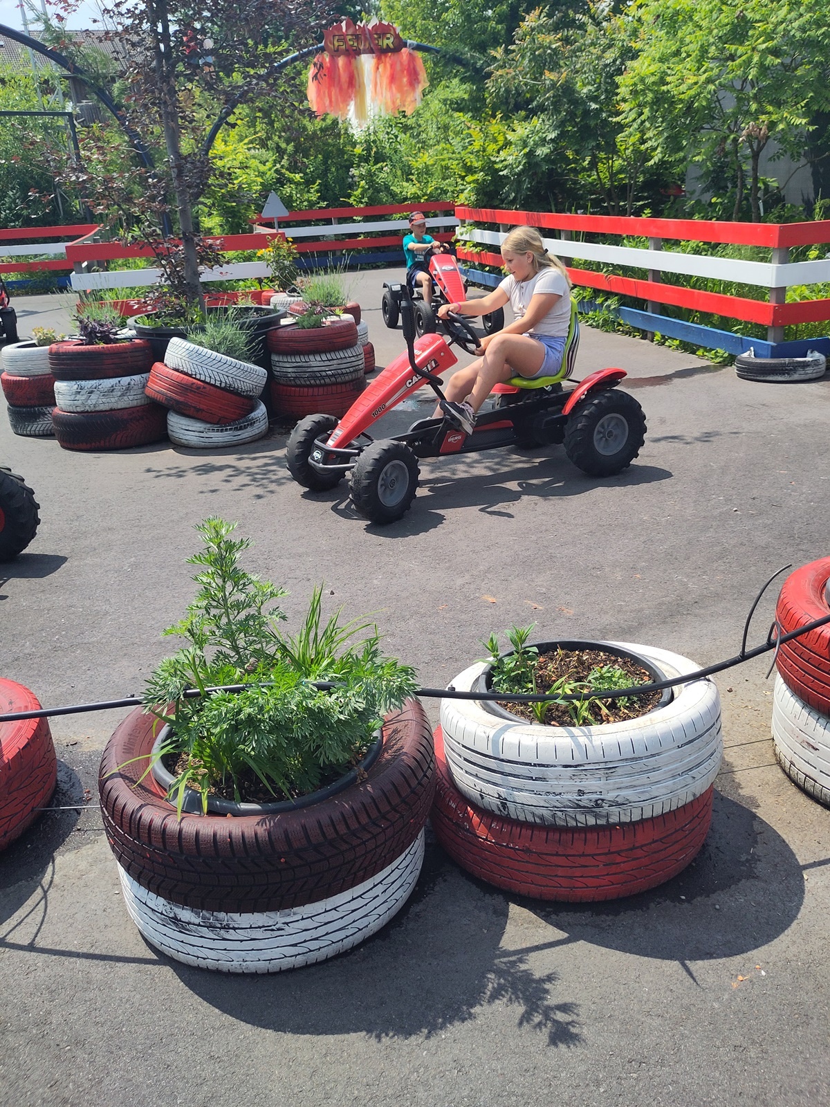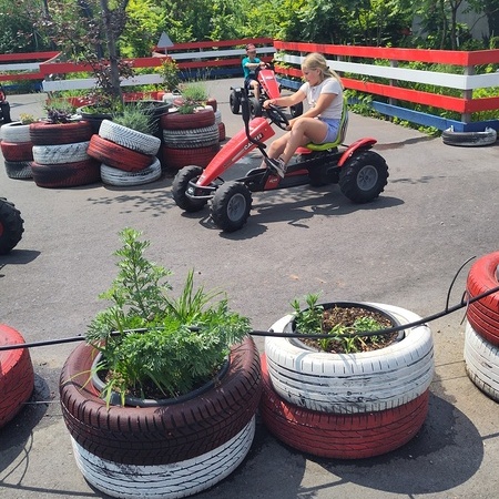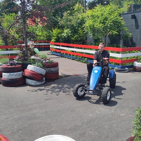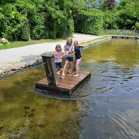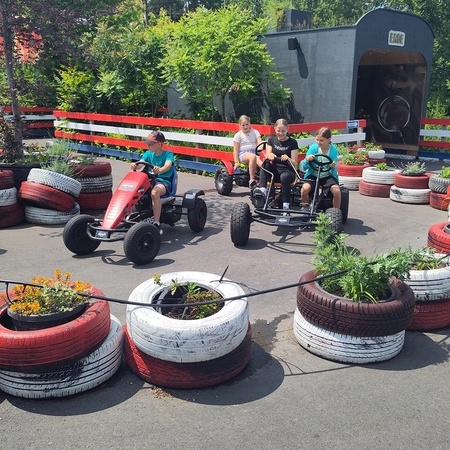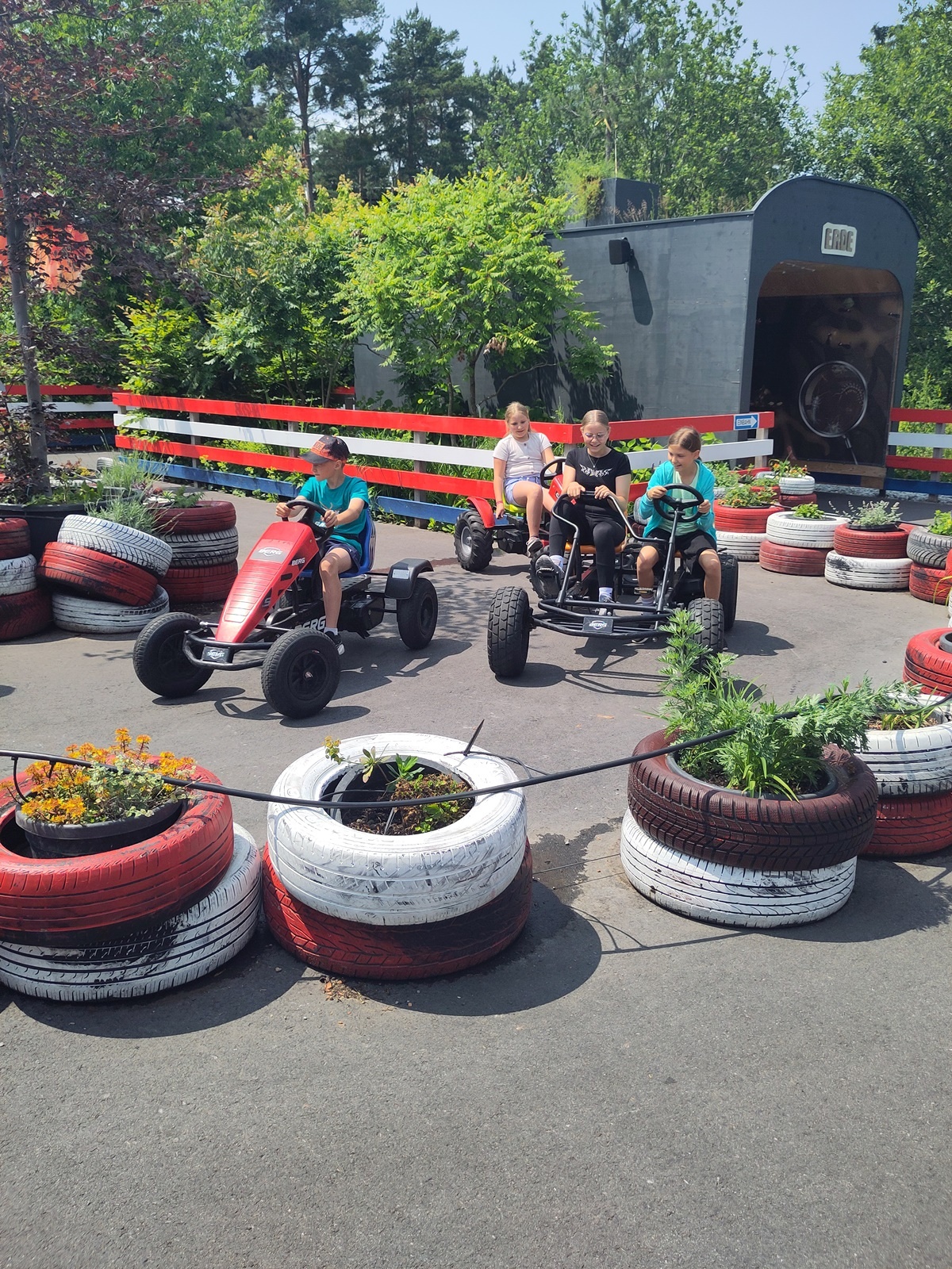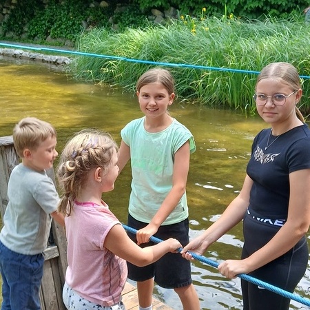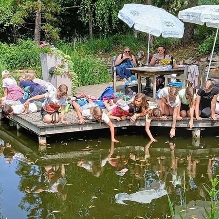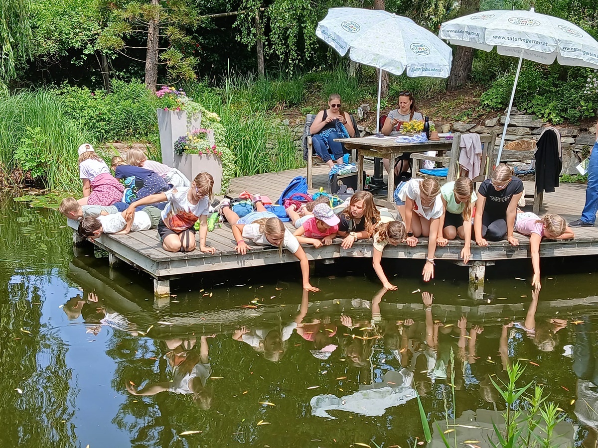 In der fantasievollen Gartenwelt jagte ein Highlight das nächste: Besonders beliebt war das Kartfahren auf der kleinen Rennstrecke des Parks bei dem kräftiges Treten und Lenktalent gefragt war. Auch Pater Stephan ließ es sich nicht nehmen, Runden zu drehen – sehr zur Freude der Kinder. Ein weiteres Highlight war die lange Rutsche, auf der die Kinder viel Freude hatten. Auch das Floßfahren sorgte für viel Lachen – vor allem, wenn es galt, das Gleichgewicht zu halten oder schneller als die anderen zu sein. Nach dem gemeinsamen Mittagessen sorgte der Quatschgärtner mit seinen lustigen Einlagen und verrückten Ideen für viel Spaß und beeindruckte die Gruppe mit tollen akrobatischen Einlagen. Im Labyrinth wurde der richtige Weg gesucht und auch Fangen und Verstecken gespielt. Beim Fischteich gelang es einigen, Fische zu „streicheln“.