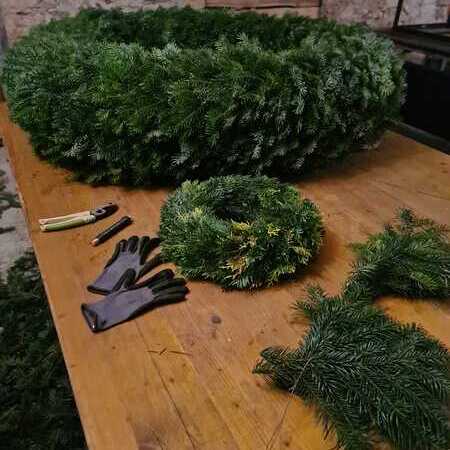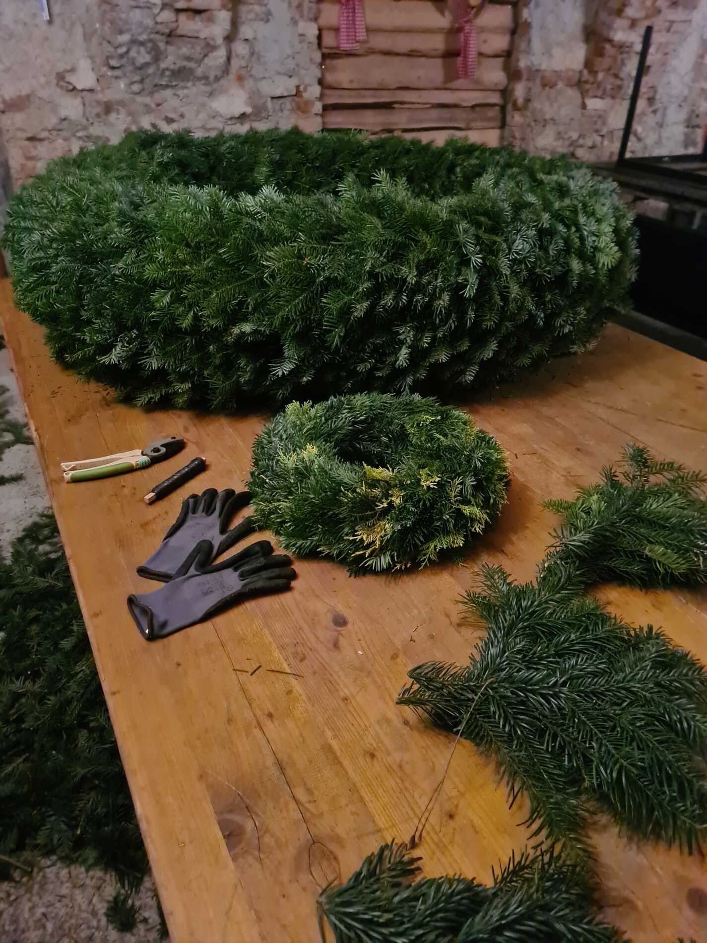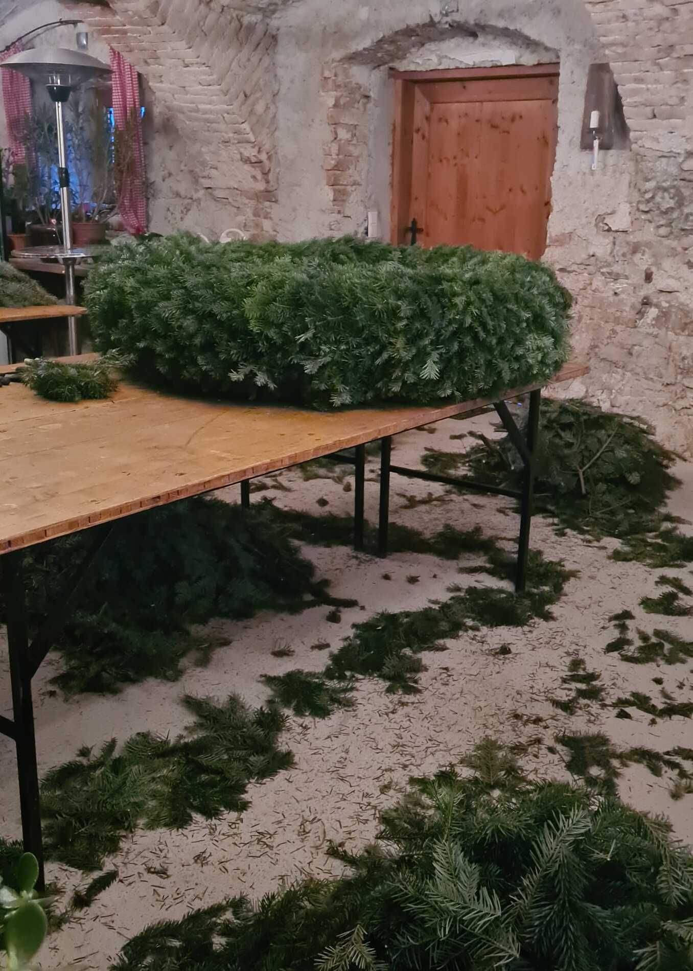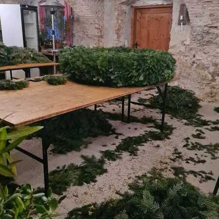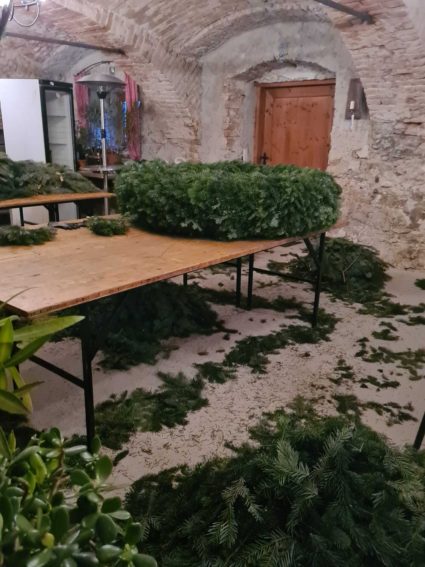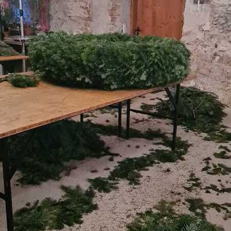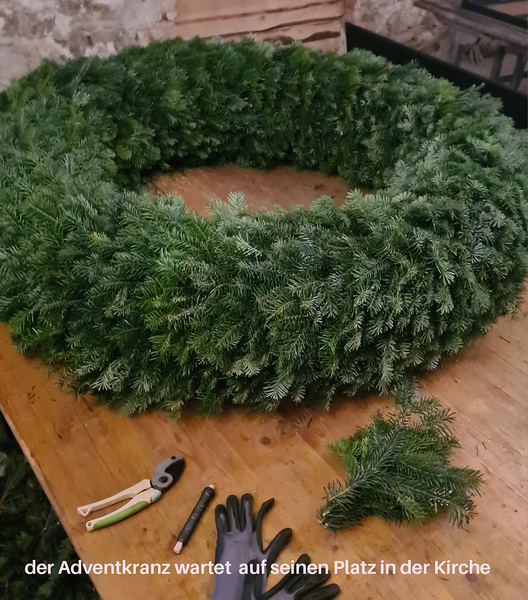 Sonntags, bei miesem Wetter, holte die Familie Rauner aus dem Waldviertel frisches Tannenreisig. Viele fleißige Frauen halfen wie jedes Jahr durch deren Hände und ihr Können mit, im Keller der Familie Rauner einen Adventkranz für die Kirche zu binden.