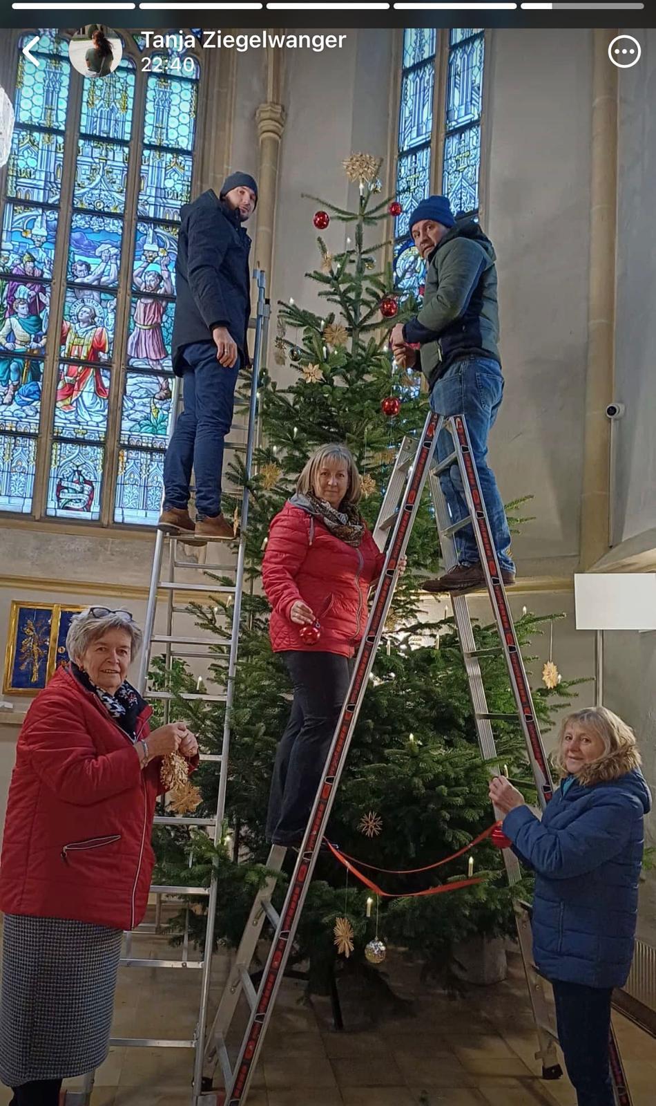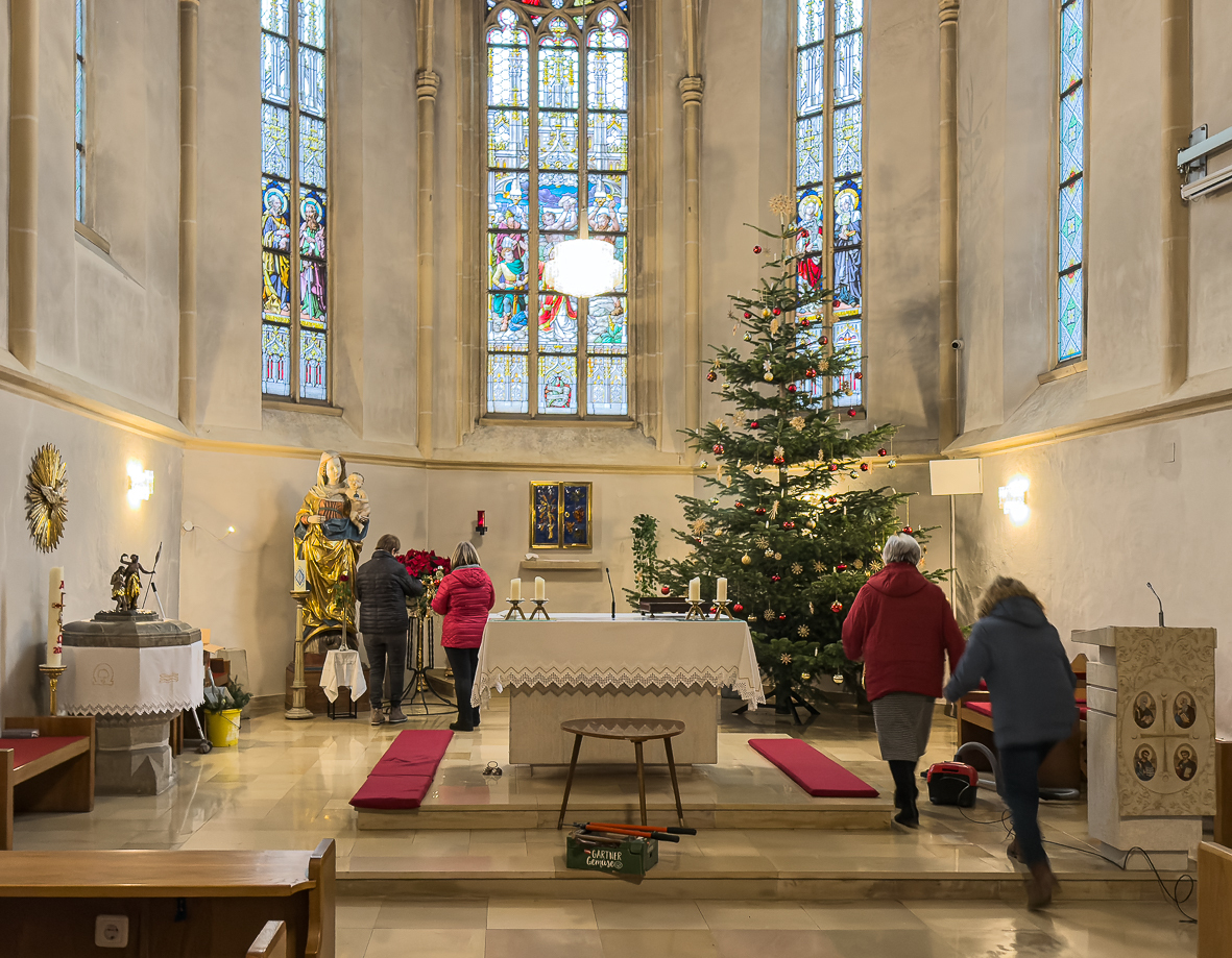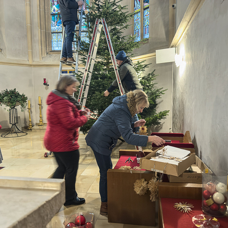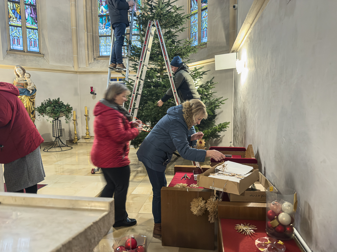 „Traditionell am Tag vor Heiligabend wird unsere Kirche für das Weihnachtsfest vorbereitet. Dank der tatkräftigen Unterstützung vieler Freiwilliger verwandelt sich der Kirchenraum in einen Ort voller Festlichkeit. Ob beim Aufbau der Krippe, der Gestaltung des Blumenschmucks, dem Wechseln der Paramente oder dem Schmücken des Weihnachtsbaums – jede helfende Hand trägt zum großen Ganzen bei. Ein herzliches ‚Vergelt’s Gott‘ für dieses ehrenamtliche Engagement!“