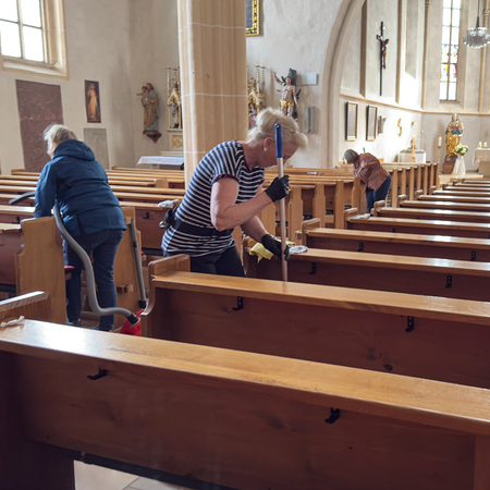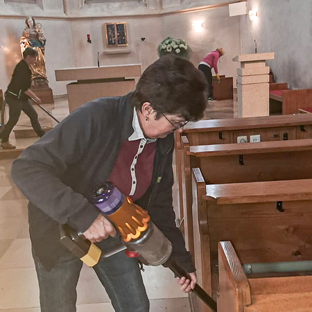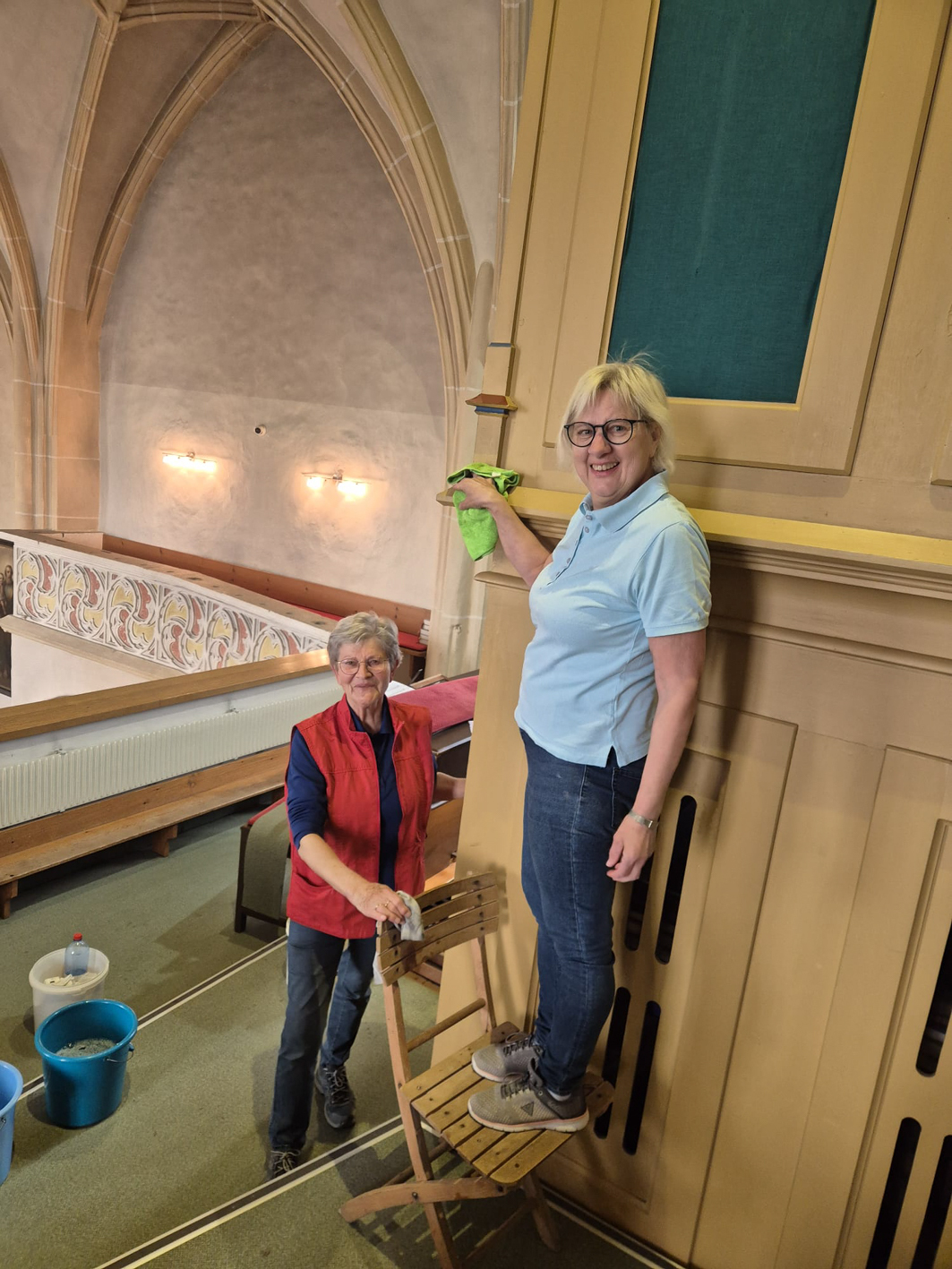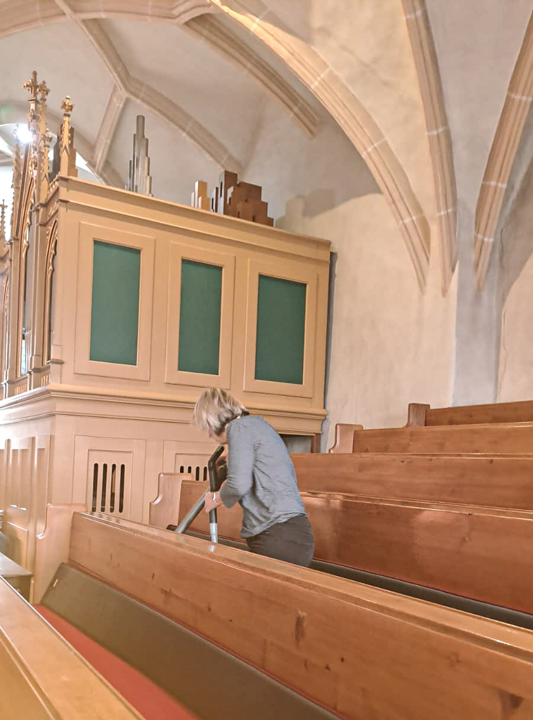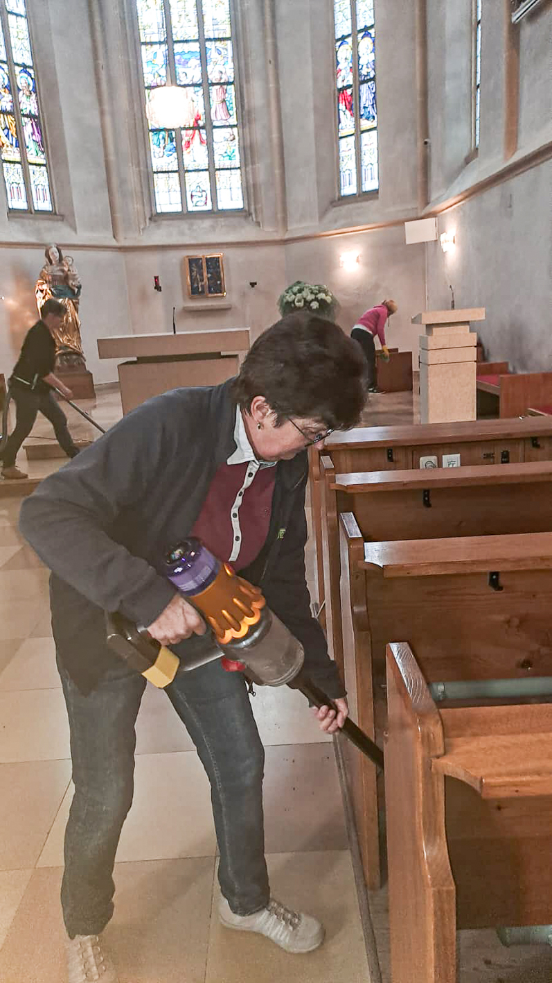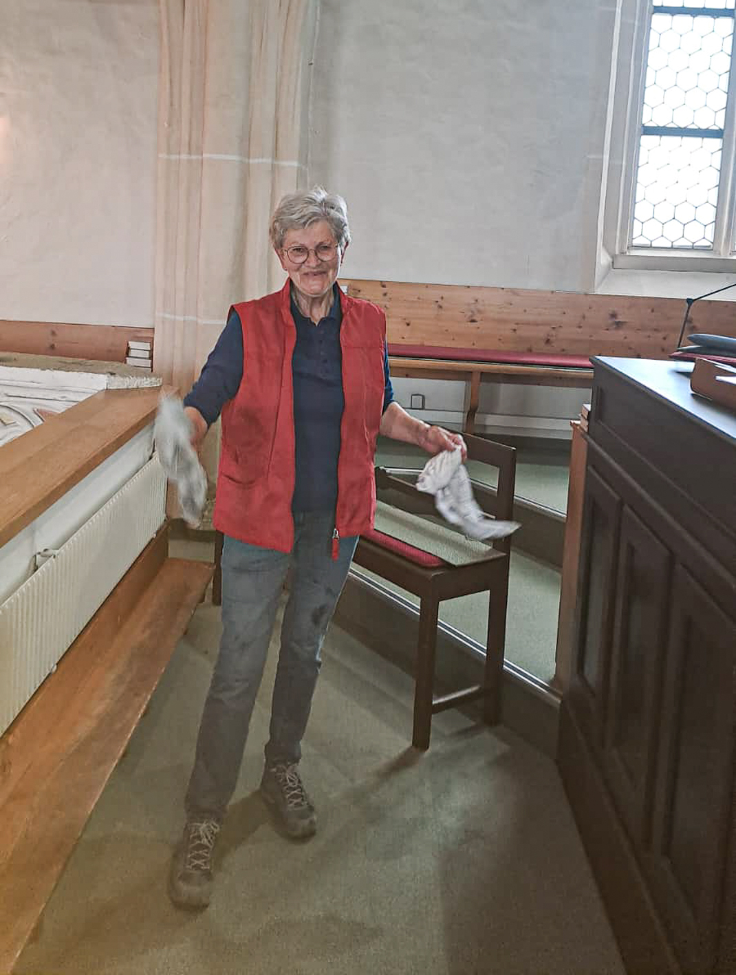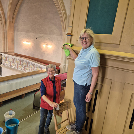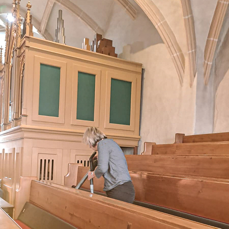 Währenddessen widmeten sich die Frauen dem Inventar. Es wurde gesaugt, gerieben, gewischt und poliert – von der Orgelempore über den Chor bis hin zu jeder einzelnen Kirchenbank.