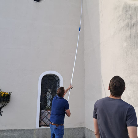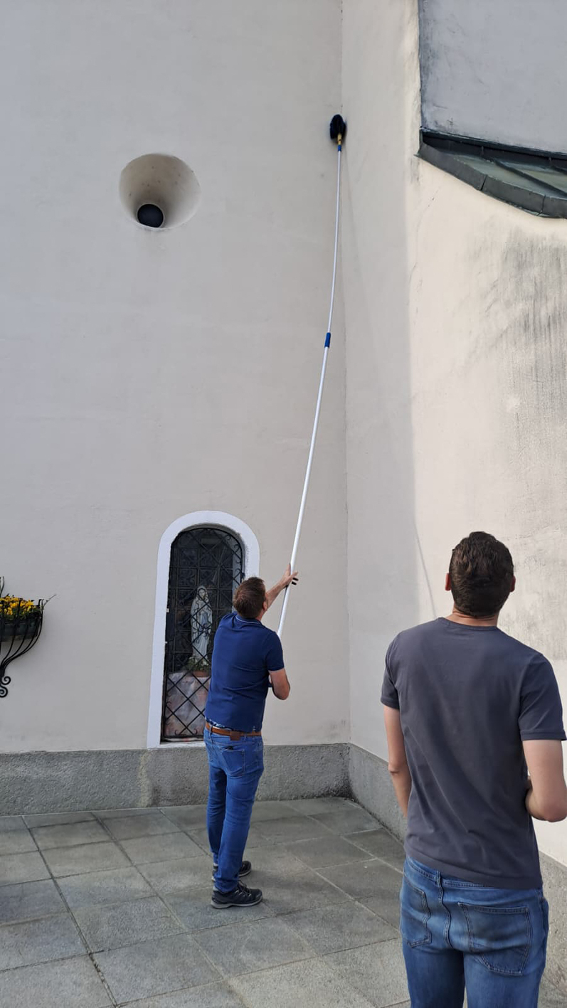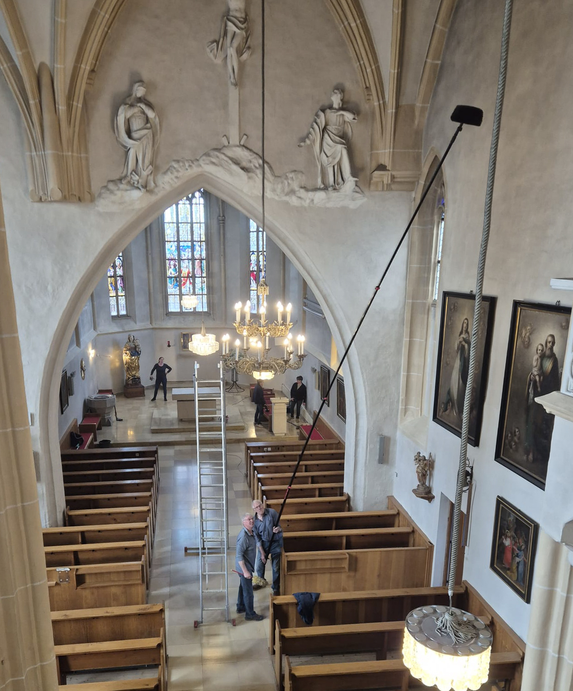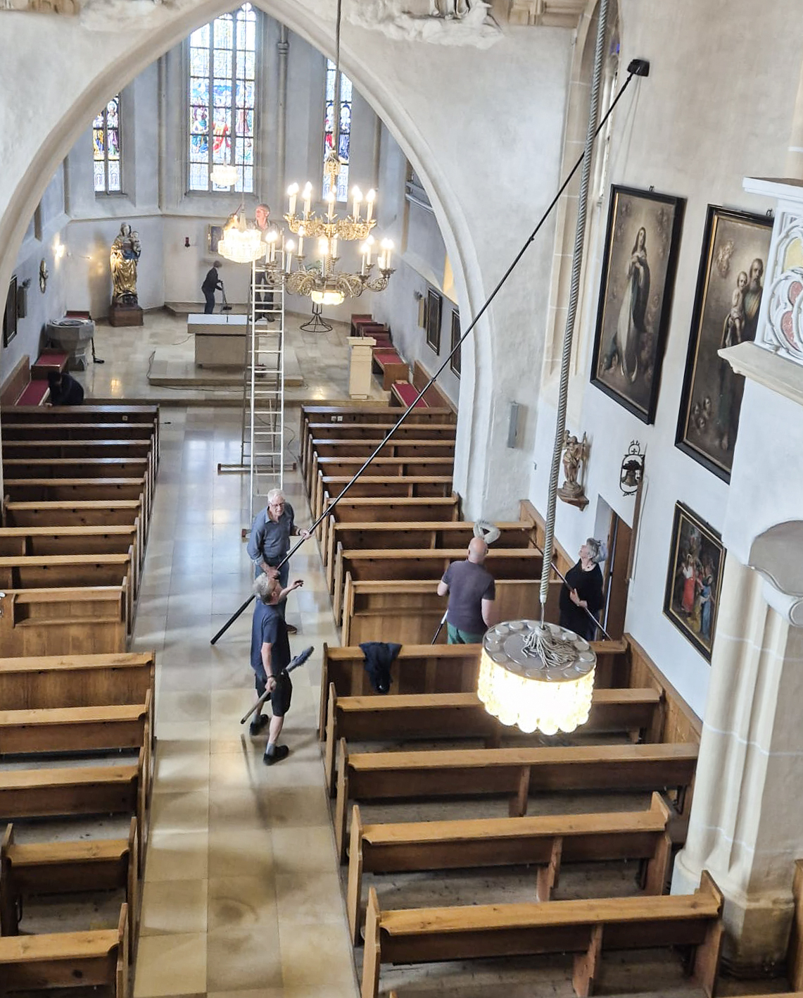Die Männer nahmen sich mit langen Stielen und Besen die schwindelerregenden Höhen vor. Spinnweben an der Decke oder an den Außenmauern hatten keine Chance, und auch die prachtvollen Luster sowie die kunstvollen Reliefs wurden behutsam von Staub befreit.