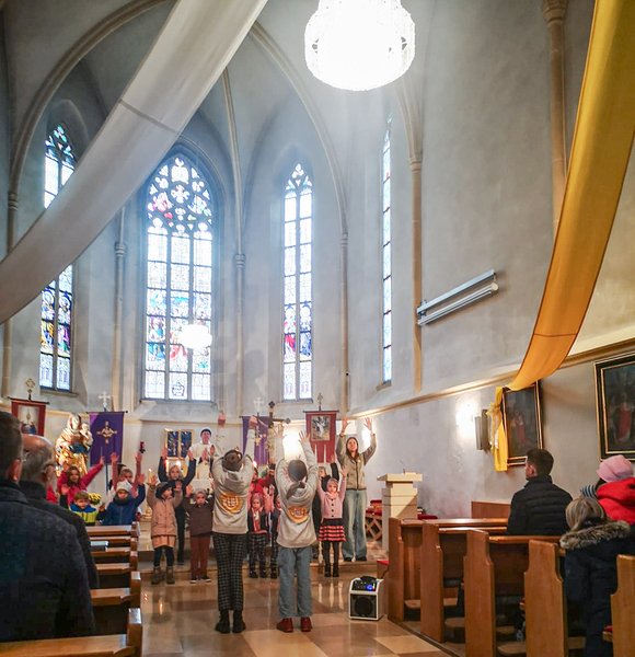 am Samstag ein fröhliches Singen, Tanzen, Spiel und Gemeinschaft mit 19 Kindern pfarrübergreifend mit Jasmin Karlinger.